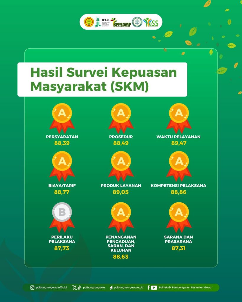 Politeknik Pembangunan Pertanian (Polbangtan) Gowa terus berkomitmen meningkatkan kualitas pelayanan publik. Berdasarkan hasil Survei Kepuasan Masyarakat, seluruh unsur pelayanan memperoleh nilai kategori “A (Sangat Baik)”, dengan rata-rata nilai di atas 87.